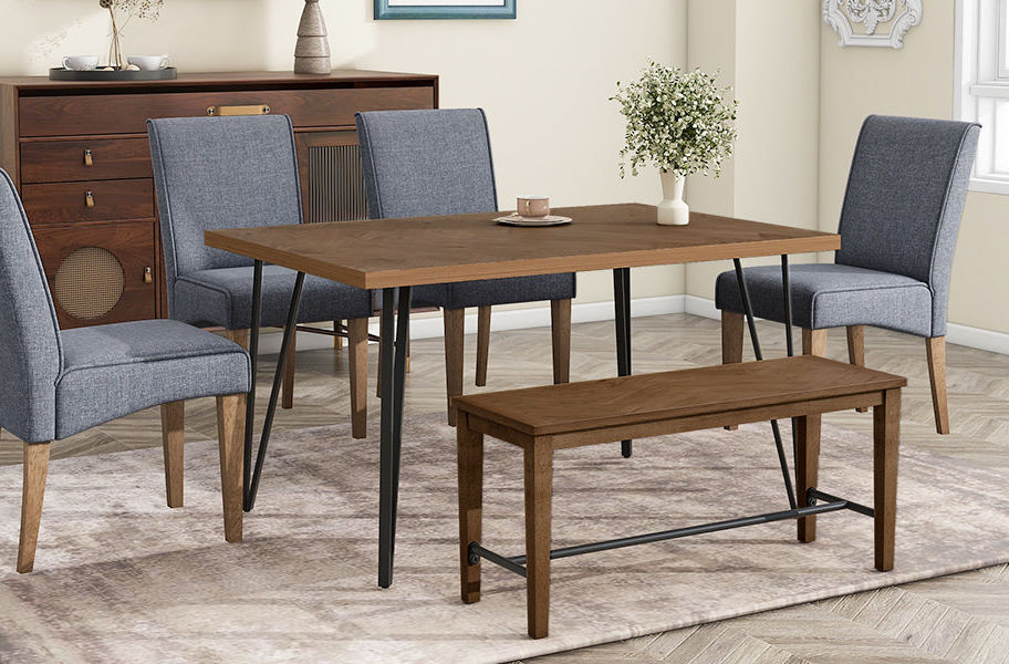 - [Modern&Rustic Dining Set for 6] This stunning 6-piece dining set boasts a combination of sleek design and functionality. It features 4 comfortably chairs and 1 bench perfectly matched with a rectangular table that sport unique V-shaped legs. The rich texture tabletop and bench top add a touch of opulence to any dining space while being effortless to maintain.