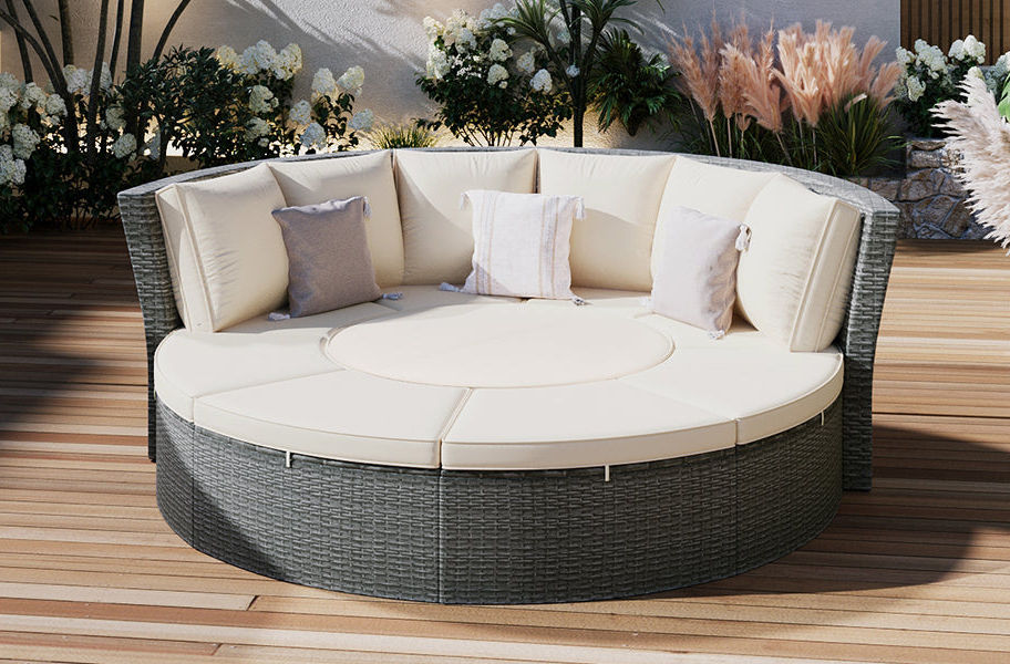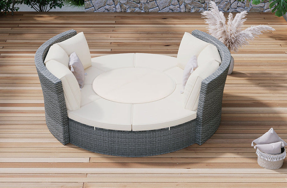 This set includes four separate loveseats, allowing for flexible seating arrangements. The loveseats can be arranged into a large sunbed, providing a luxurious spot for sunbathing or lounging under the stars.